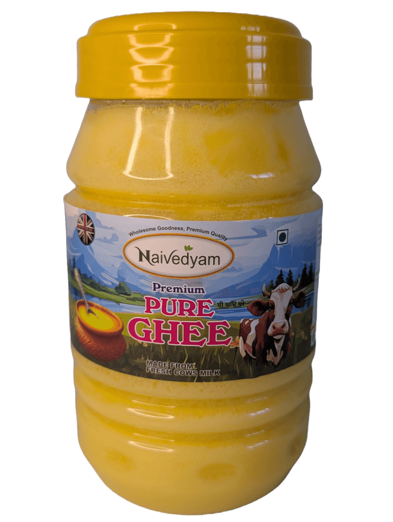 Naivedyam’s Pure Ghee is a tribute to the timeless traditions of Indian cooking. Made from fresh British Cow’s milk using age-old techniques, our ghee captures the rich aroma, deep flavor, and unmatched quality that have defined Indian cuisine for millennia. Whether used for cooking, baking, or drizzling over warm meals, its golden richness enhances every dish with an authentic touch of heritage.